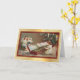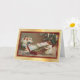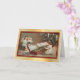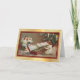 The front of this Holiday greeting card features a vintage image of a little girl playing an old fashioned xylophone with two angels as her choir. In the background is the family Christmas tree. The image is placed on a light infused gold gradient background, and is bordered in dark red with a thin gold line.. The inside top of the card is matching solid Holiday red. The bottom is white, with custom text fields for your own message and signature. Celebrate Christmas the old fashioned way with this beautiful card showcasing an image from days gone by.