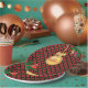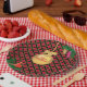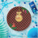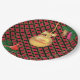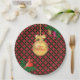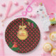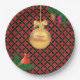 Christmas golden ball, pine cones and cardinal bird on black, golden and red chequered background Party Paper Plate. There is more to this design than meets the eye.