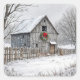 A rustic barn is adorned with a festive Christmas wreath against a backdrop of gently falling snow