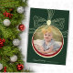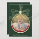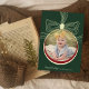 This elegant Christmas card features a classic bauble design and festive bow in gold set against a deep green background with red accents along with a round photo template inside the bauble. Ideal for Christmas, family photos and holiday wishes.