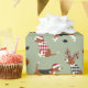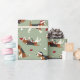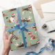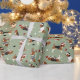Cute beagles dressed in festive holiday outfits, Santa hats and argyle sweaters with scattered Christmas ornaments on a green background.