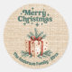 Beige faux burlap as background, green text. Merry Christmas is written with a retro style font. Decorated with a gift box with pine branches. Personalise and add your family name and a year.