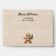 Beige faux burlap as background. Personalise and add a name and your return address. The name is written with a modern and trendy handlettered style script. Decorated with a happy smiling gingerbread man holding a Christmas tree.