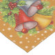 Christmas table runner with big vibrant bells in red, blue, gold on holly and berries with a gold and snowflake background.