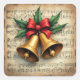 Golden Christmas Bells with red decorative ribbon on a music sheet background.