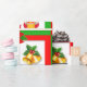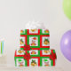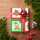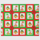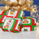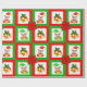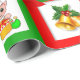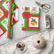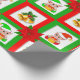 Christmas bells, poinsettia, elf on green & red wrapping paper