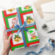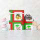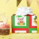 Christmas bells, poinsettia, elves on green & red wrapping paper