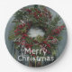 Festive Merry Christmas white typography. Pretty Christmas Wreath with red berries and icicles hanging from a slate blue etched glass gold trim front door. Original Photography © TamiraZDesigns.