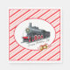 This paper napkin is shown in White with a festive Christmas train print on a candy cane stripes background.
