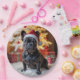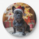 A French bulldog wearing a Santa hat sits on a fluffy rug in front of a decorated Christmas tree