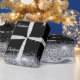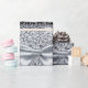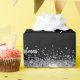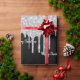 Elegant, classic, glamourous and feminine style party wrapping paper for Christmas. A black background decorated with faux silver glitter drips and sparkle, a silver bow and ribbon.