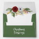Christmas Blessings green envelope depicts an elegant winter floral with a simple red and white rose, berries and greenery. It features a printed return address on the back top.