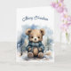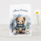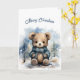 This is an illustration of an adorable bear in a winter setting. The bear is sitting down, wearing a cosy blue coat and a matching scarf. The background features a snowy landscape with trees, enhancing the wintry atmosphere. The bear has a cute and friendly expression, with large, expressive eyes that contribute to the overall warmth and charm of the illustration. Like the previous image, this artwork aims to evoke a sense of comfort and endearment, perfect for the winter season.