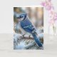 A vibrant blue jay gracefully perched on a snowy pine branch, a stunning contrast against the pristine white landscape.
