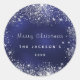 A deep blue background decorated with faux silver glitter dust. The blue colour is uneven. Personalise and add your name and a year. With the text: Merry Christmas.