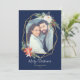 This elegant holiday card features a pretty gold geometric frame decorated with festive Christmas floral bouquets, all against a pretty navy blue background. The bouquets are made up of roses, poinsettias, pine cones, berries, and pine branches. Personalize with a custom holiday greeting, your names, and favorite photo. The back of the card is a lovely shade of cranberry red, but is customizable to any color you'd like!