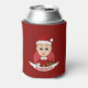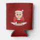 Can cooler with an illustration of a cute smiling happy blonde-haired boy, he is wearing red and white Santa Claus costume and holding a present; with editable text template for your name or message, Christmas holidays design with a red background
