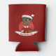 Can cooler with an illustration of a cute smiling happy boy with glasses, he is wearing red and white Santa Claus costume and holding a present; with editable text template for your name or message, Christmas holidays design with a red background
