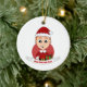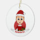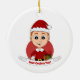 Christmas ornament with an illustration of a cute smiling happy ginger-haired boy, he is wearing red and white Santa Claus costume and holding a present; with editable text template for your name or message, Christmas holidays design
