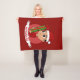 Throw blanket with an illustration of a cute smiling happy toddler boy, he is wearing red and white Santa Claus costume and holding a present; with editable text template for your name or message, Christmas holidays design with a red background