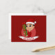 Postcard with an illustration of a cute smiling happy toddler boy, he is wearing red and white Santa Claus costume and holding a present; with editable text template for your name or message, Christmas holidays design with a red background