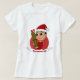 Women's T-shirt with an illustration of a cute smiling happy toddler boy, he is wearing red and white Santa Claus costume and holding a present; with editable text template for your name or message, Christmas holidays design