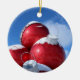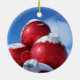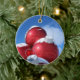 High quality photo of red bulb decorations with snow and blue sky. Photo placed on ornament for your tree.