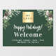 Emerald green background, white text. Personalise and add your logo. Text: Happy Holidays! and Welcome. Decorated with pine sprigs and cones.
