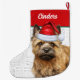 So sweet, this two-sided Christmas stocking has a watercolor illustration of a holiday dressed Cairn Terrier dog and your pup's name on both sides with a woof word art background.