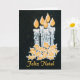 A chic Christmas Card with the greeting in Portuguese and five candles with holly, hand-painted in gold and silver paint on a starry black background.