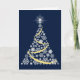 This is a pretty card which features a Christmas tree made with an assortment of white snowflakes. A gold color garland decorates the tree. It is on a navy blue background.