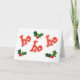 A Christmas Card with 'ho ho ho' in red and gold letters and holly, from a handpainted paper collage design by Judy Adamson. This design is also available on gifts and apparel.