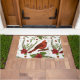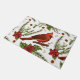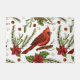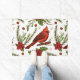 A red cardinal feasts on white mistletoe berries surrounded by Christmas greenery against a snow white background