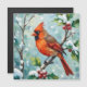 A charming scene of a single red cardinal perched gracefully on a snow-dusted holly branch, its crimson feathers a vivid pop of colour against the cool greens and whites. The rich watercolor palette focuses on jewel tones—emerald and ruby —with gentle washes creating a soft, ethereal background of blurred winter foliage. The brushstrokes are fine and detailed for the bird, becoming softer and more impressionistic for the setting, conveying quiet beauty and peace.