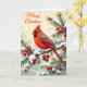 A sweet Christmas card with a red cardinal sitting on a snowy pine branch covered in snow and red berries.