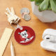 Button keychain with illustration of a head of cute panda bear with Santa's hat; great decoration for Christmas holidays, editable template design with custom field for your own text, illustrated by Radka Kavalcova