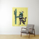 Christmas cactus tapestry with a digitally coloured ink drawing of a lovely kitty character with a flower on its head almost suffocated by a cactus with the same flowers and a garland Christmas balls hanging on it.