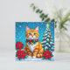 A personalized Christmas card with a front cover of an orange cat sitting out in the snow with poinsettias and a Christmas tree and decorated collar. On the back you can add your own custom message, or leave the cute cat pun filled message, and add two photos in the personalize area.