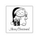 Smiling white cat in a traditional Christmas hat holding a large wrapped present is wishing everyone a very merry Christmas! In its left paw the cat is holding high a bell with a bow.