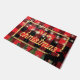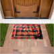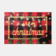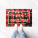 Christmas celebration party light reindeer doormat. The image on the background is buffalo plaid red and black. The frame is golden shine. More decor are light, black reindeer, forest and snow.