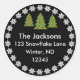 This is a cute sticker to put on your Christmas envelopes or packages. It has a chalkboard background with white text. It features snowflakes and evergreen trees with red ornaments.