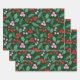 The wrapping paper is a festive amalgamation of classic Christmas symbols and colours. On a deep green background, a repeating pattern showcases delicately interwoven strands of golden tinsel and holly leaves with their bright red berries. Interspersed between these are small, intricately detailed snowflakes, each unique in design, shimmering with a subtle silver foil effect. Generously scattered across this seasonal tapestry are miniature illustrations of Santa's sleigh, reindeer in mid-flight, and cosy little cottages with smoke rising from their chimneys, suggesting the warmth of a fireplace within. The overall look captures the essence of Christmas, inviting the anticipation of unwrapping and the joy of the holiday season.