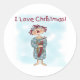 Christmas holiday greeting cards, magnets, mousepads, T-shirts, sweatshirts, and other ragdoll items featuring dressed in a blue polka dot dress holding a candy cane and Christmas stocking and red text that reads 'I Love Christmas!".