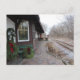 Scene of the Watertown, WI Chicago and Northwestern Depot around Christmas time. No snow yet at the time, but many great wreaths and decorations on the building as well as the old baggage cart outside by the tracks.