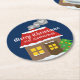Christmas coasters with cute winter cabin cottage illustration. Fun Holiday party supplies for home and office. Custom accessories and decorations for the winter season. Add your own family name and cheerful greeting.