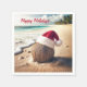 A coconut wearing a Santa hat rests on a sunny beach with gentle waves in the background.