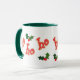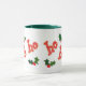 A white ringer mug with hunter green rim and handle with 'ho ho ho' in red and gold letters and holly, from a handpainted paper collage design by Judy Adamson. This design is also available as a Christmas card and on gifts and apparel.