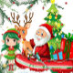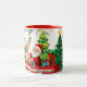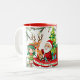 Santa Claus, Cute Elf and Reindeer, and Christmas Tree Background Coffee Mug