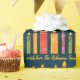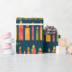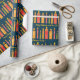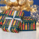 Candle wrapping paper featuring a repeat pattern of collage-style colourful Christmas candles on a dark blue background, with space to add your own personal message. Currently reads Merry Christmas, The Robinson Family x. Original art and design by Sarah Trett for www.mylittleeden.com