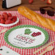 "Christmas Cookie Exchange" party paper plates with cute Christmas oven mitts illustration and red and white polka dots design. Digital illustration by Kristine Lee. For more, visit www.kristineleedesigns.com